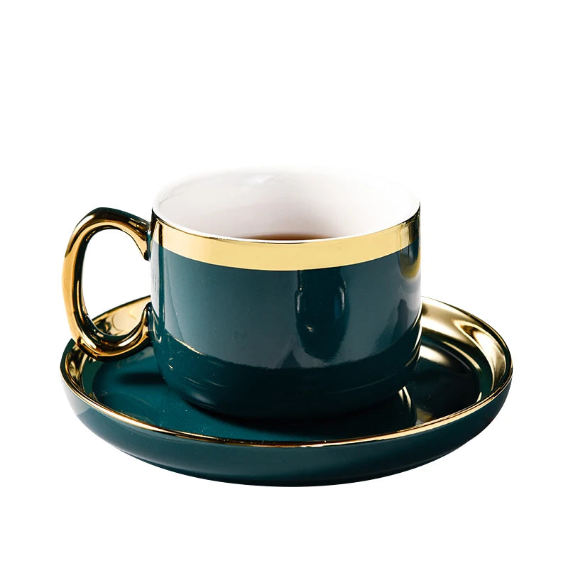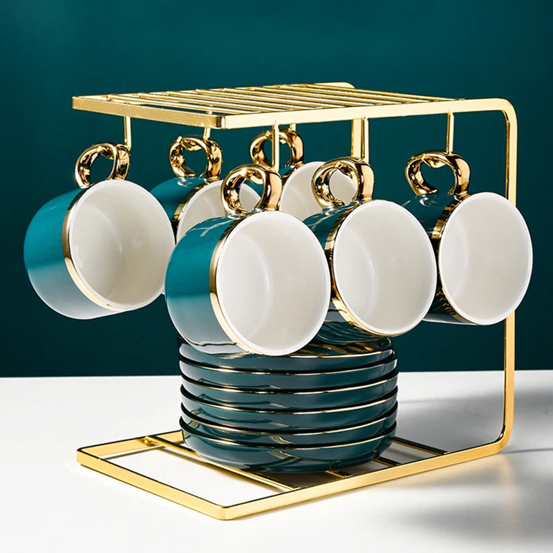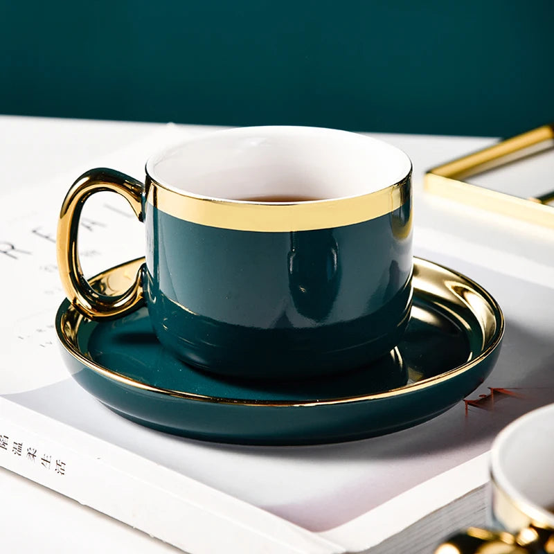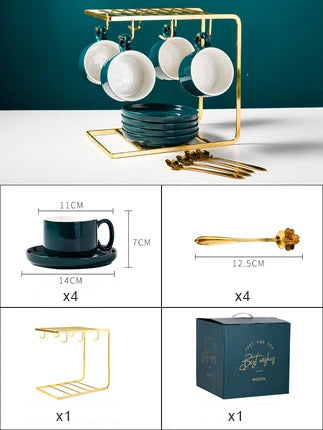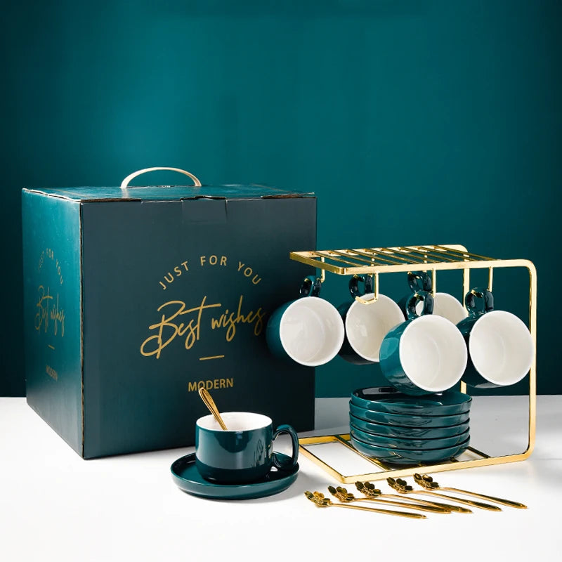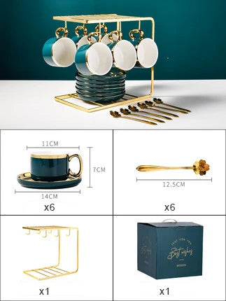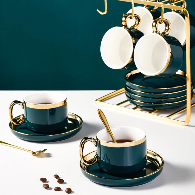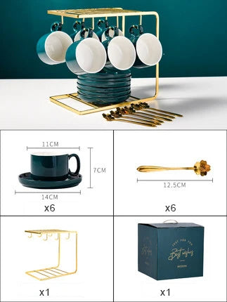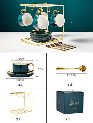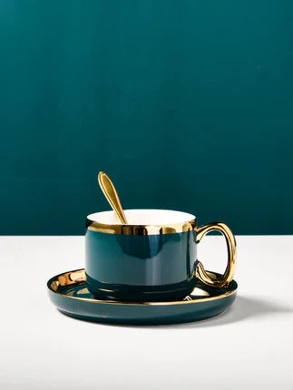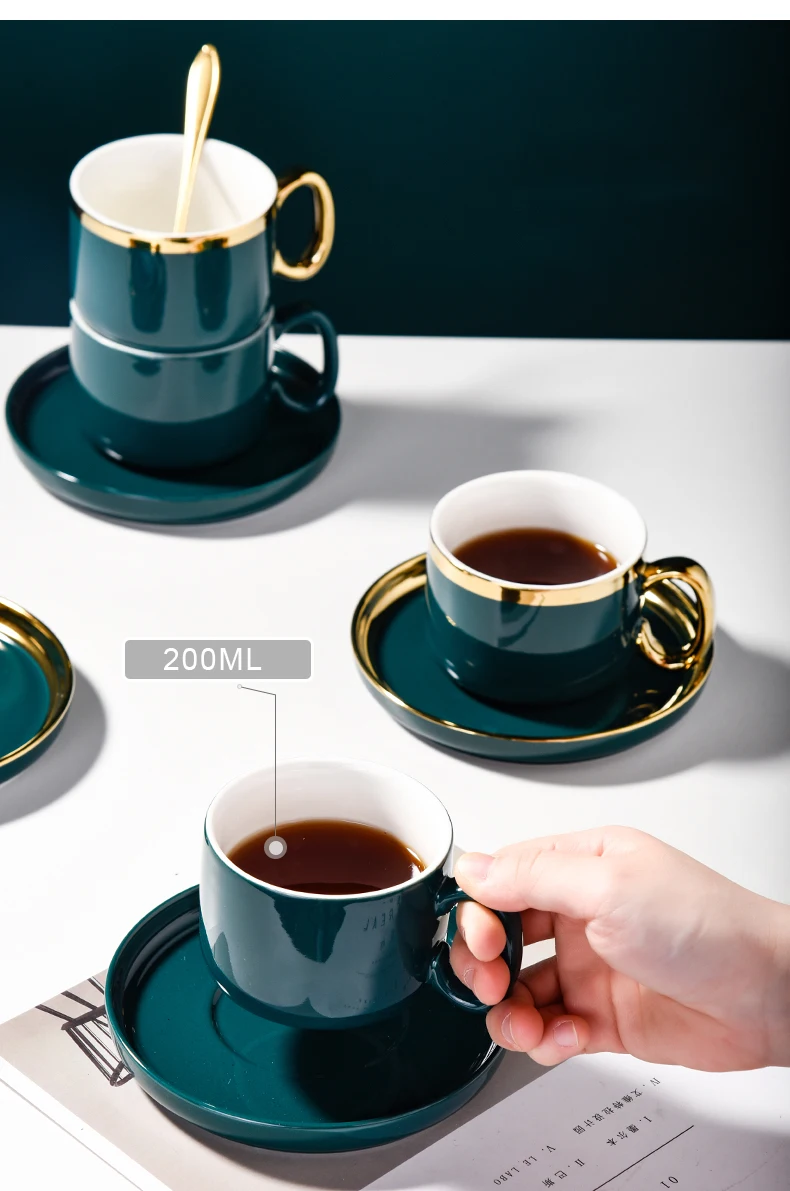 Classic Ceramic Coffee Cups Mugs Porcelain Square Tea Drinkware Spoon Saucer Set Golden Edges and Handles Creative Design - Baryk.shop